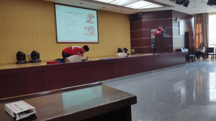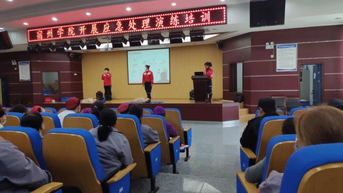 培训分为两个部分。首先李达红从法律法规、学生教师防护办法、常态化防控措施、疫苗接种相关知识等方面为大家做了“常态化下新冠肺炎疫情防控”培训。然后宿州市红十字救援队的讲师从院前救护的重要性、心肺复苏操作技术、AED的使用等几方面为大家做了“应急处理演练”培训。