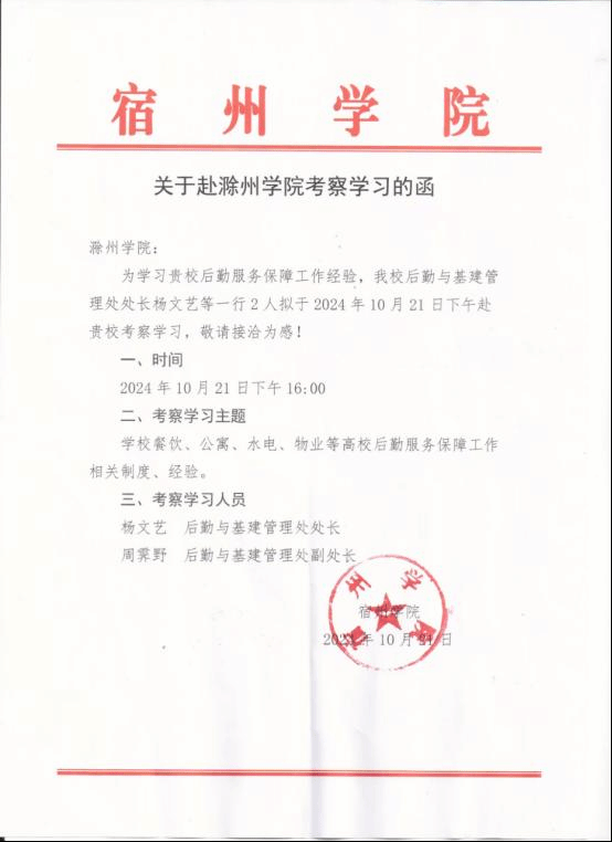 10月21日下午,宿州学院后勤与基建管理处长杨文艺、副处长周霁野一行2人到滁州学院考察学习学校餐饮、公寓、水电、物业等高校后勤服务保障工作相关制度、经验。滁州学院后勤管理与基建处处长赵来,副处长屠磊首先表示了对宿州学院后勤与基建管理处一行人的到来表示热烈欢迎,而后详细介绍了滁州学院后勤服务保障工作的一些经验做法和目前在后勤管理方面存在的重点和难点。