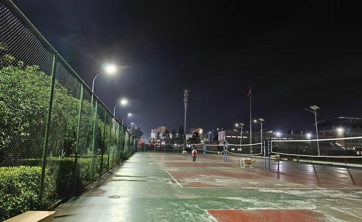 为确保照明效果与使用安全,后勤与基建管理处进行了周密设计与施工:科学布光,在排球场光线较暗区域架设5盏高亮度LED球场灯,灯光覆盖均匀无死角,有效避免运动时的眩光干扰;灯杆稳固,基础牢靠;设置定时智能开关,保障了使用的便捷。