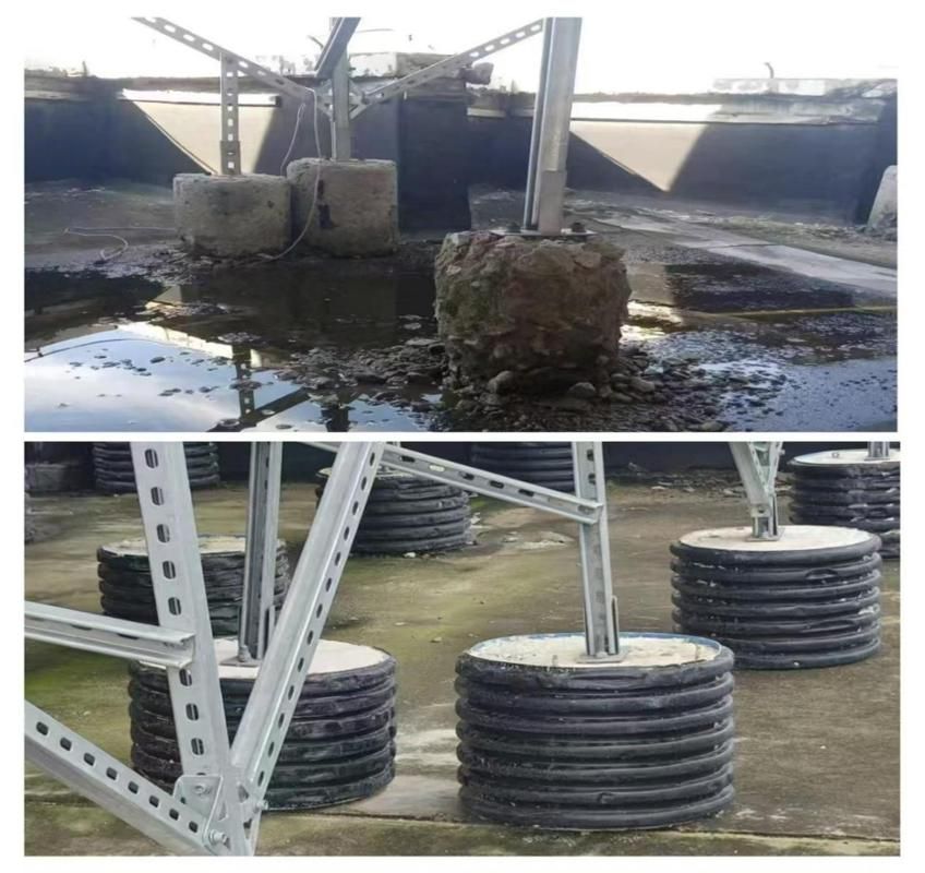 此前,音乐楼顶光伏板底座损毁严重,光伏固定基座的螺栓裸露在外,若遭遇暴雨、大风等极端天气,光伏板极易从楼顶脱落,不仅存在伤人、砸物的安全风险,也影响光伏发电的正常运行。为保障项目持续发挥效益、有效延长项目寿命,后勤与基建管理处及时响应,启动基座加固工作。