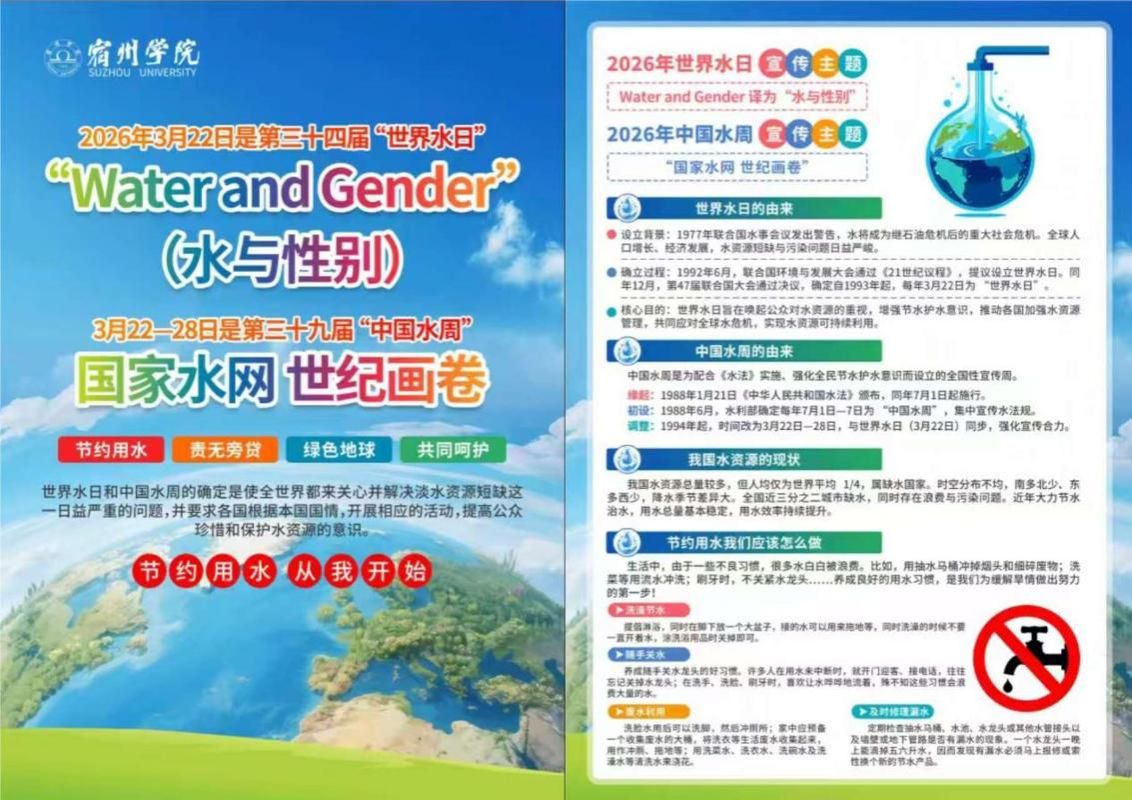 2026年3月22日是第三十四届“世界水日”,主题为“水与性别”;3月22日—28日是第三十九届“中国水周”,我国宣传主题为“国家水网 世纪画卷”。水是生存之本、文明之源,建设国家水网、优化水资源配置,是新时代赋予我们的重要使命。高校作为人才培养的重要阵地,应带头践行节水理念,引领节水风尚。为深入推进节水型高校建设,现向全校师生发出如下倡议: