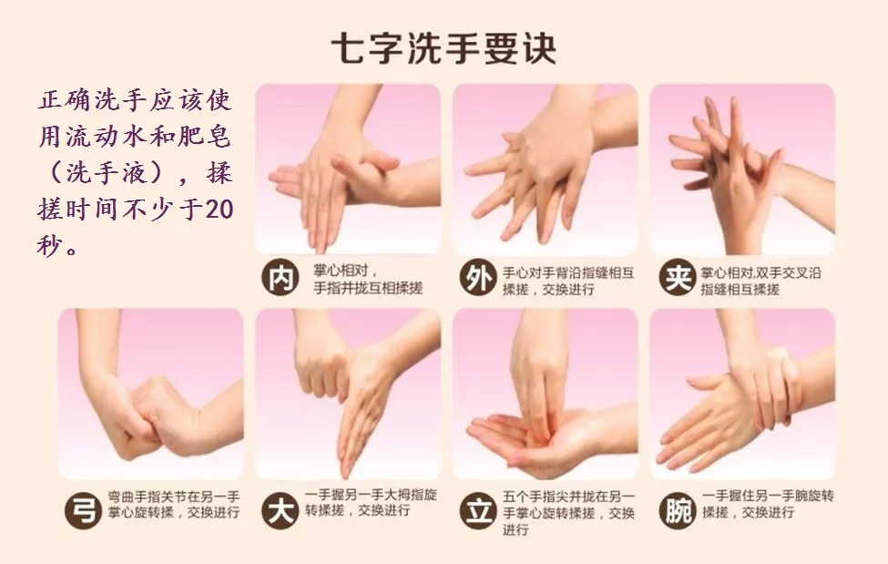 在咳嗽或打喷嚏后、护理患者后、用餐前后、便前便后、接触动物或处理动物粪便后、戴口罩前、摘口罩后都必须洗手。你知道怎么正确洗手吗?洗手可不是一件简单的事。要记牢七个字:内、外、夹、弓、大、立、腕。