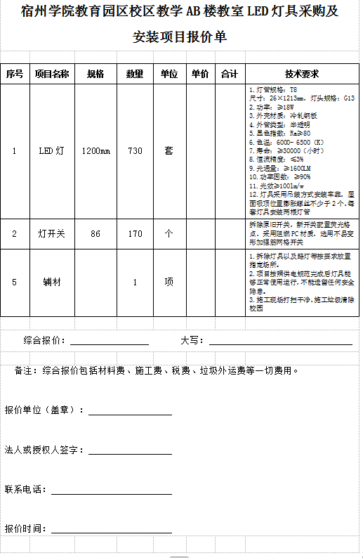 根据《宿州学院采购管理办法》(校国资〔2020〕3号),经后勤与基建管理处研究同意,并报请分管校领导审批,现就宿州学院教育园区校区教学AB楼教室LED灯具采购及安装项目采购询价公告如下: